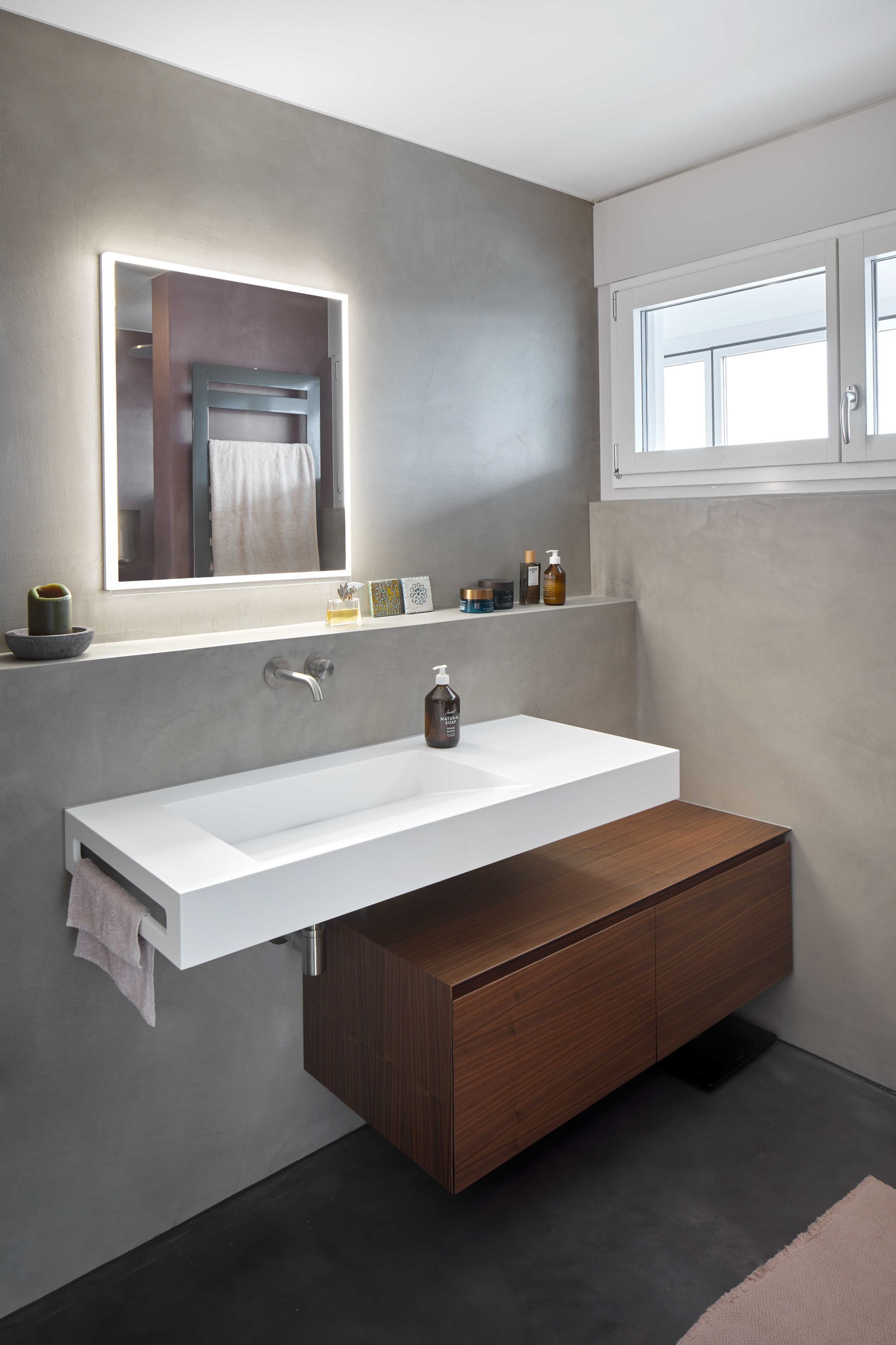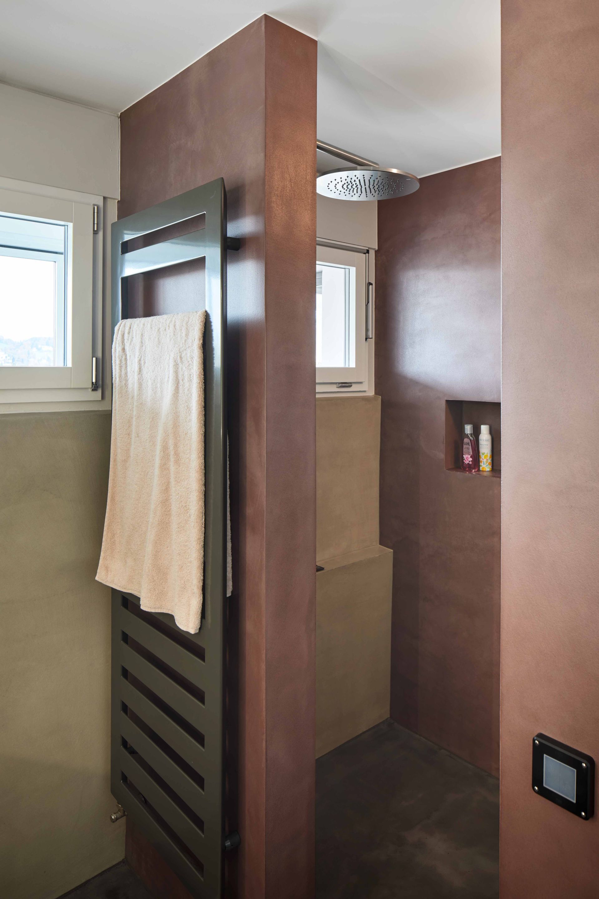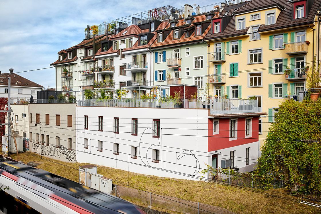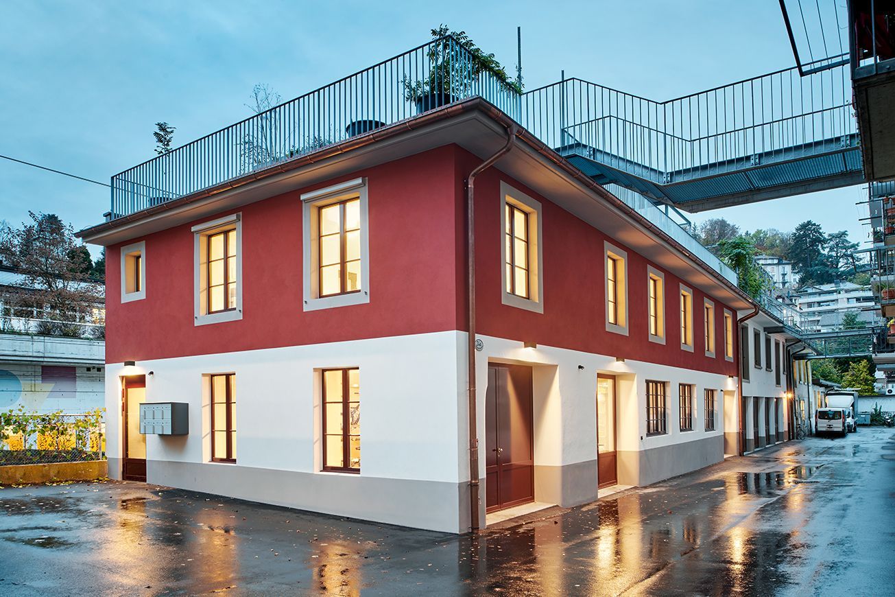 Die Aufgabe bestand darin, die brachliegende Grundstücksfläche des Gewerbe- und Wohngebäudes besser auszunutzen. Mit einer Machbarkeitsstudie wurden die verschiedenen Optionen und Nutzungsmöglichkeiten ausgelotet und mithilfe von Arbeitsmodellen evaluiert. Schlussendlich fiel der Entscheid, zwei eigenständige, kleine Wohneinheiten zu erstellen, die auf Stützen stehen, damit die Zufahrt zu den bestehenden Garagen und Werkstätten gewährleistet werden kann. Gleichzeitig wurden so auch gedeckte Autoabstellplätze geschaffen. In Anlehnung an die karge und massive Erscheinung des bestehenden Gewerbegebäudes wurden die beiden Kuben aus massiven Sichtbetonelementen erstellt. Mit dem warmen roten Farbton der Betonelemente setzen sie sich aber vom nüchternen Grau der bestehenden Fassaden ab. Die Flachdächer sind extensiv begrünt und mit Sonnenkollektoren bestückt, die nicht nur die neuen Wohnungen, sondern auch das bestehende Gebäude mit Warmwasser versorgen. Die Wohnungen haben drei bzw. vier Zimmer und bieten mit den grosszügigen Fensterflächen eine wunderbare Aussicht auf die Berge und den nahegelegenen Waldrand. Die vorgelagerte Balkonschicht ermöglicht die Nutzung des Aussenraums in einer privaten Sphäre. Dank dem massgeschneiderten Innenausbau mit sorgfältig erarbeiteten Details und auserlesenen Materialien konnte auf bescheidener Fläche eine hohe Wohnqualität geschaffen werden.