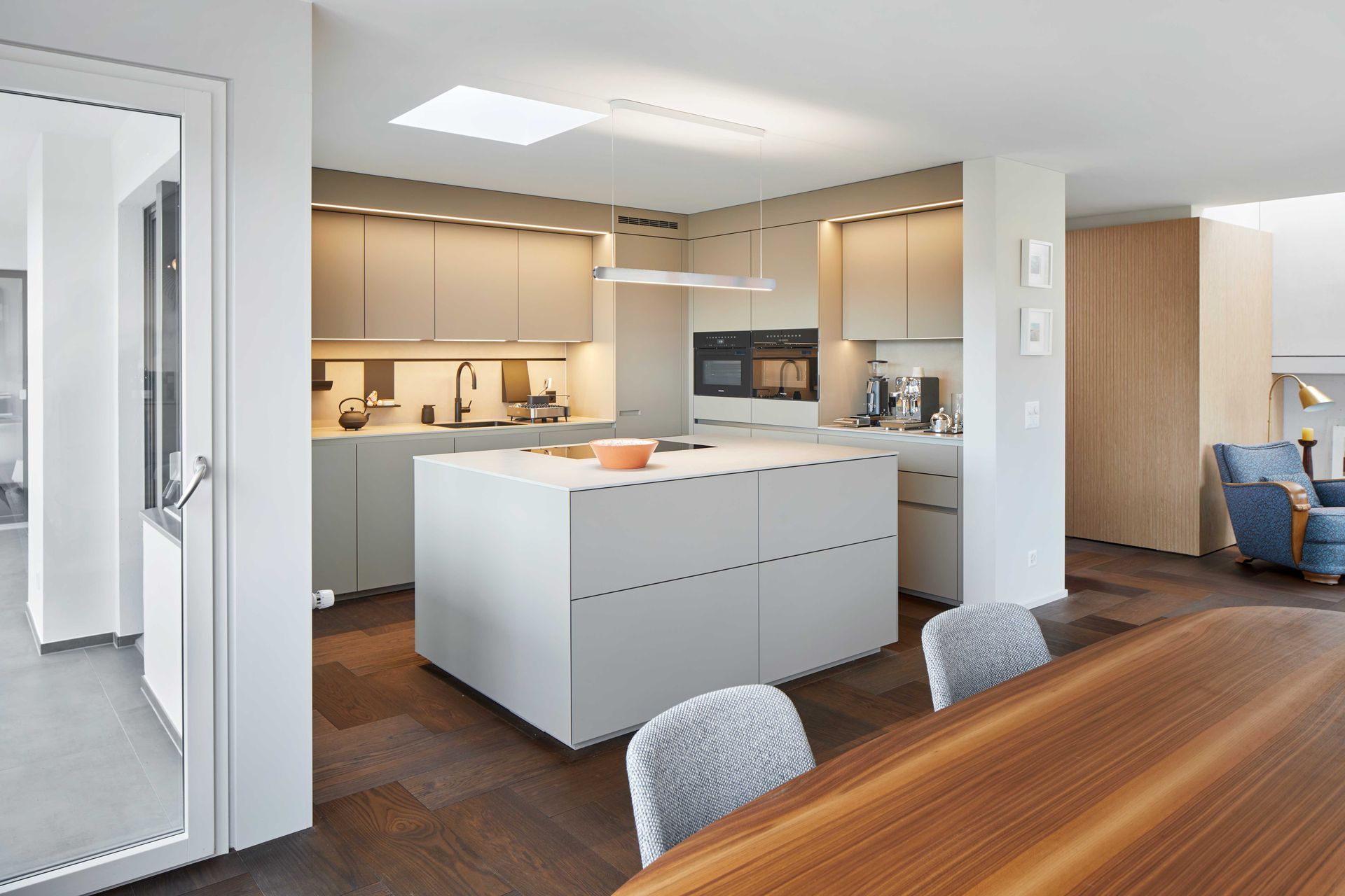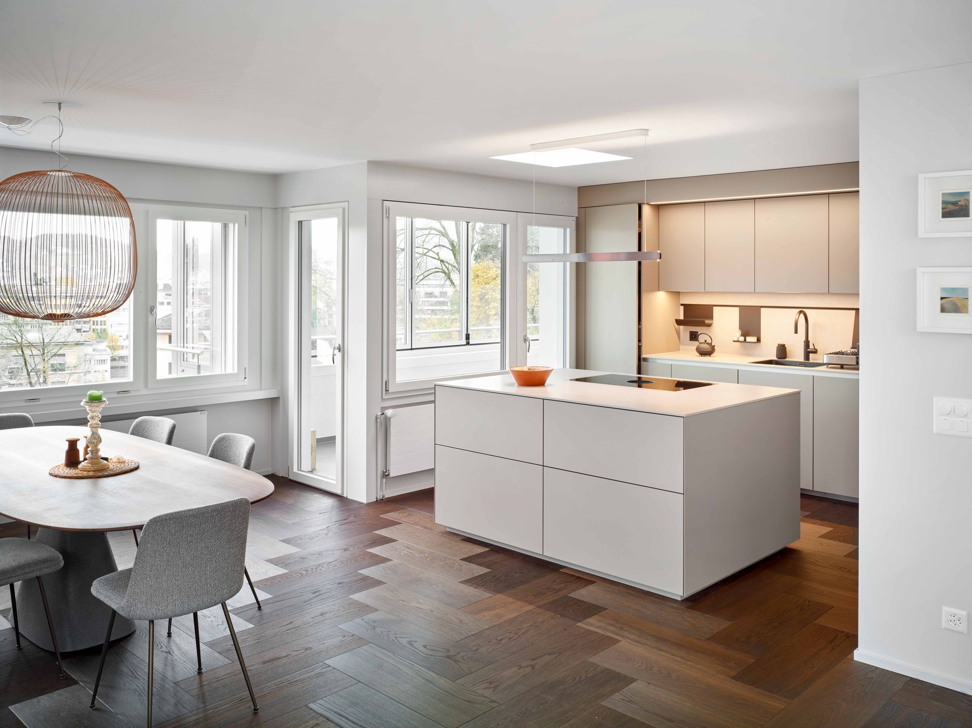 Vorerst musste eine aufwendige Schadstoffsanierung durchgeführt werden, in dem der problematische Unterlagsboden ausgebaut und durch einen neuen ersetzt wurde. Im Weiteren wurden mittels Wandabbrüchen die Küche zum Wohnraum geöffnet und zwei Zimmer zusammengelegt. Sämtliche Räumlichkeiten und insbesondere die Küche, das Bad und das WC wurden mit geschmackvollen Materialien und Farben und mit durchdachten Einbauten gestaltet. Auch das zeittypisch wuchtige Cheminée aus den 60er-Jahren wurde modernisiert und mit einem Kamineinsatz energieeffizient umgerüstet.