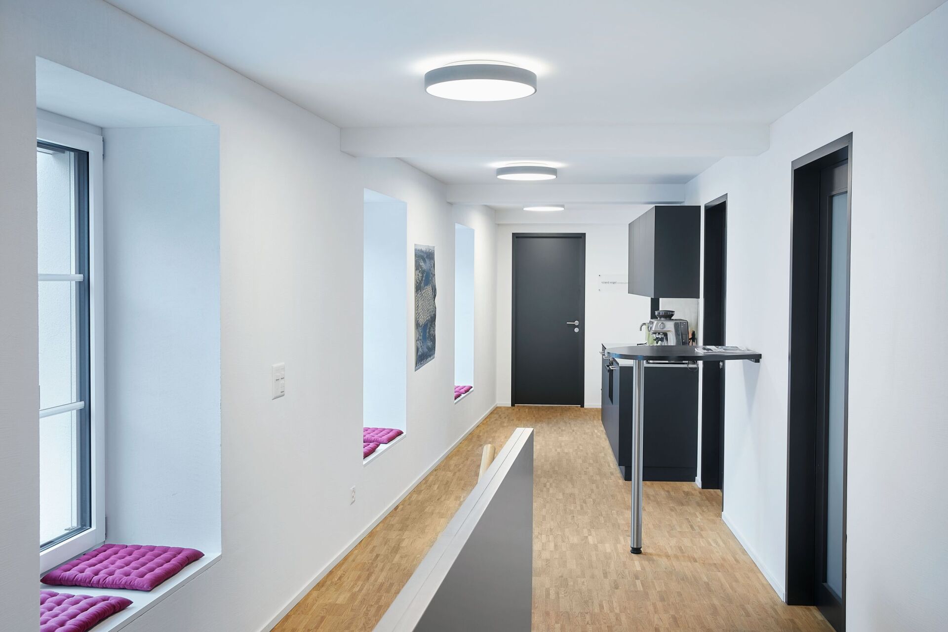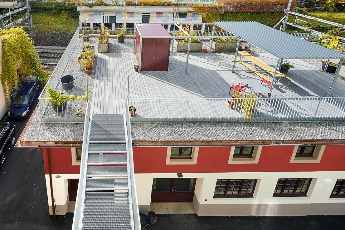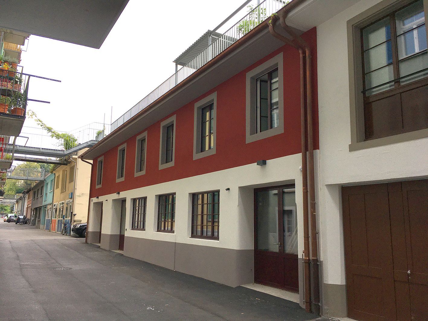 Die Nutzung blieb nach der Sanierung etwa die gleiche: Im Erdgeschoss befinden sich eine Werkstatt und ein Veloraum, im Obergeschoss wurden Büro- und Atelierräume eingerichtet. Auf dem Flachdach wurde eine attraktive