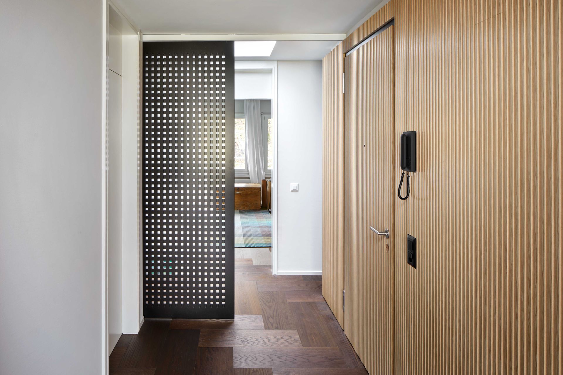Die 4-Zimmer-Wohnung im 6-stöckigen Wohngebäude mit angebautem Bürotrakt wurde komplett renoviert und an die Bedürfnisse der neuen Bewohner angepasst. Die Lage der Wohnung im obersten Stock stellte eine besondere Herausforderung an die Zulieferung zu bzw. Abtransporte von der Baustelle. Da das interne Treppenhaus mit vorhandenem Lift nicht benutzt werden konnte, wurde aussen an der Fassade ein Gerüstturm mit einem Material- und Personenaufzug aufgestellt, über den die Versorgung der Baustelle reibungslos funktionierte.